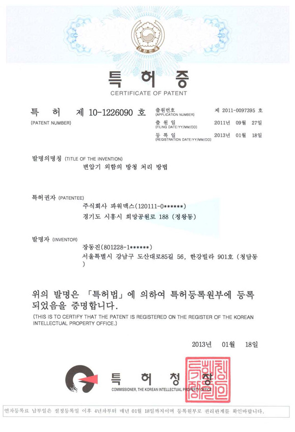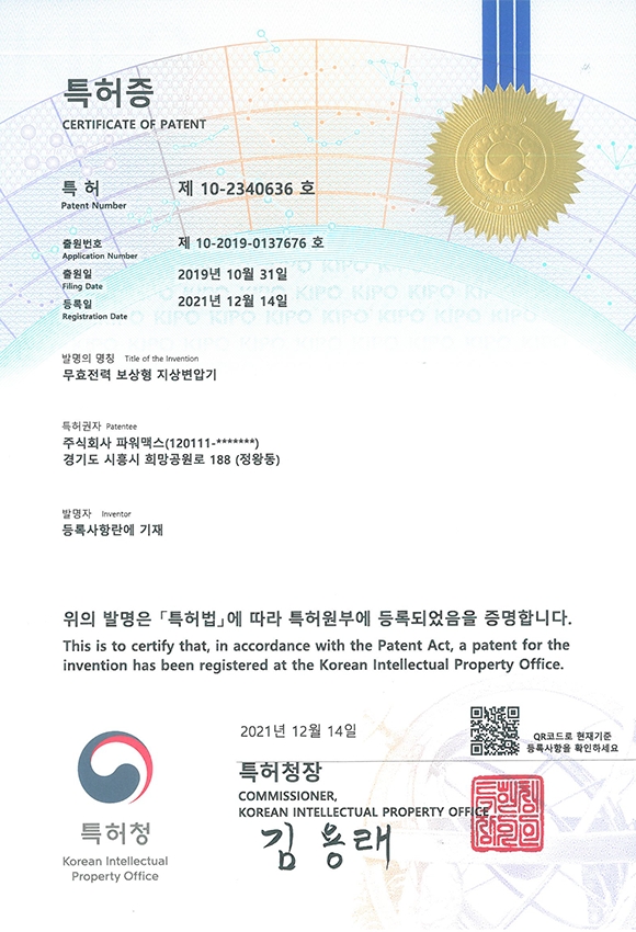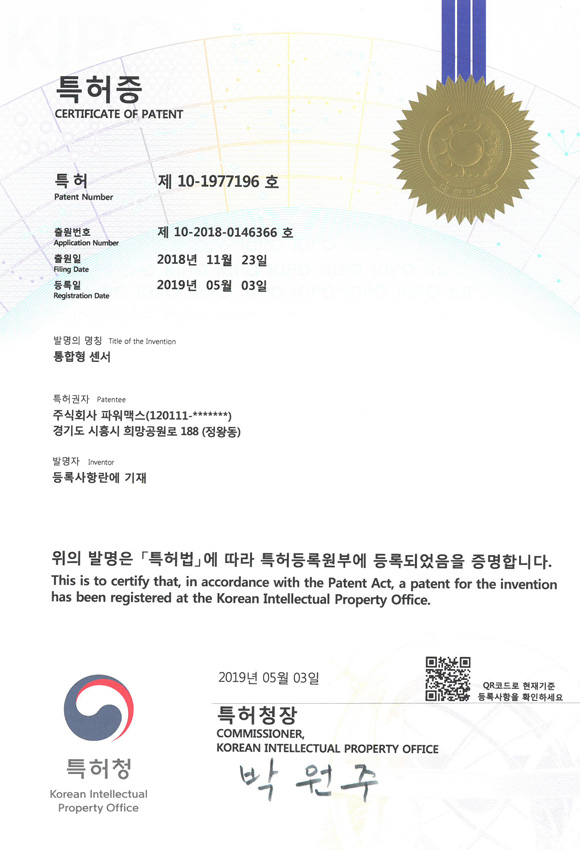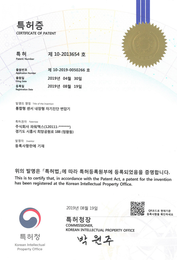 특허증 – 통합형 센서 내장형 자기진단 변압기