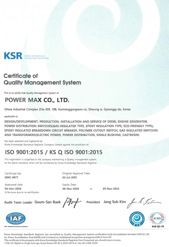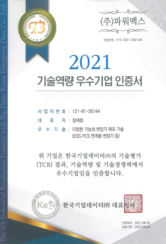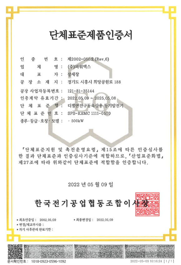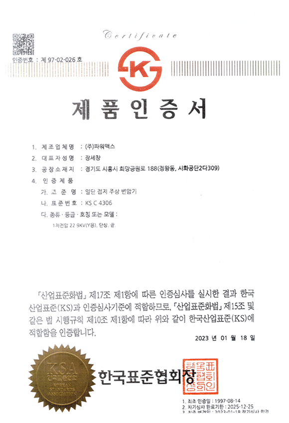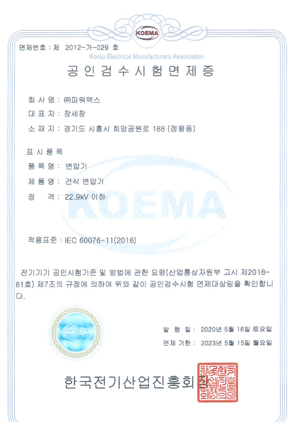 공인검수시험면제증 – 건식 변압기 22.9kV이하