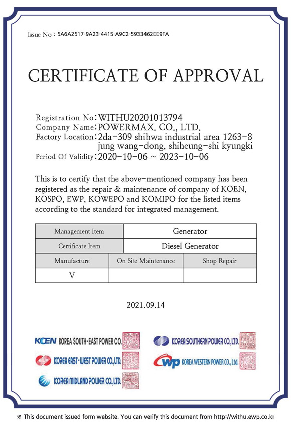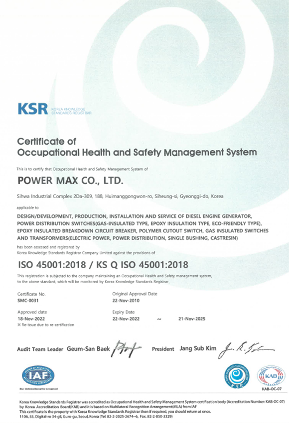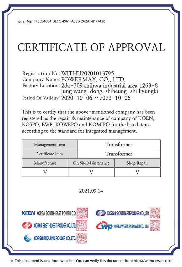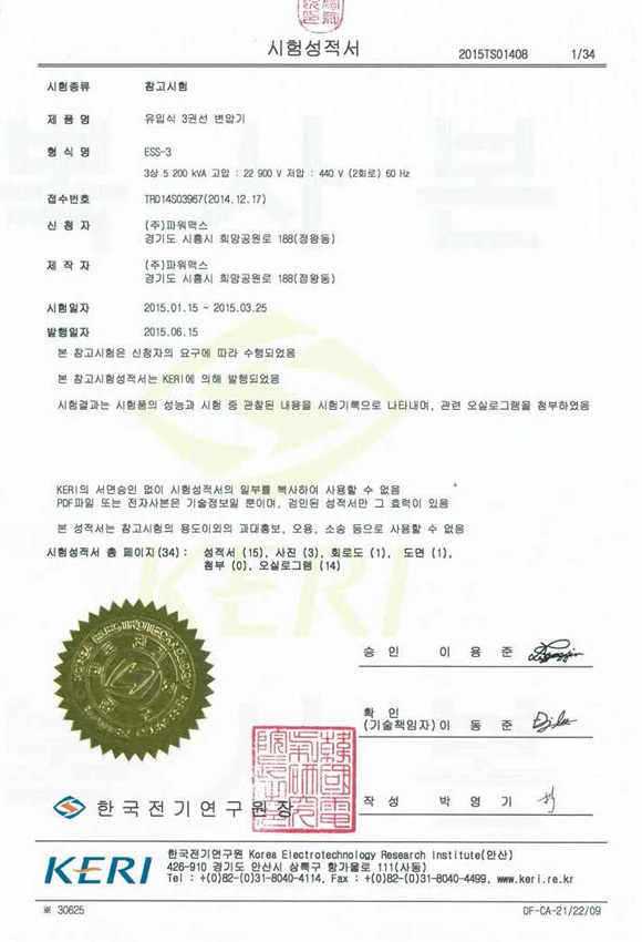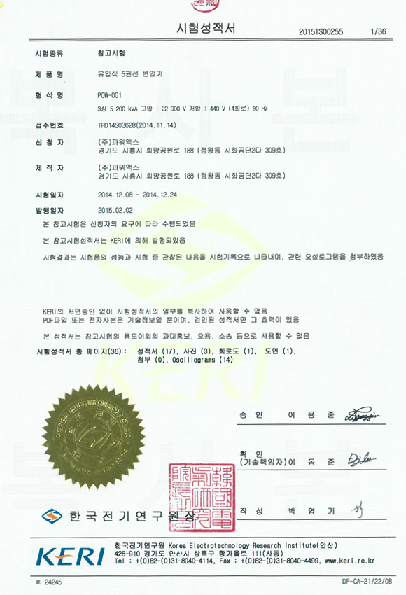 공인검수시험면제증 – 유입 변압기 22.9KV이하