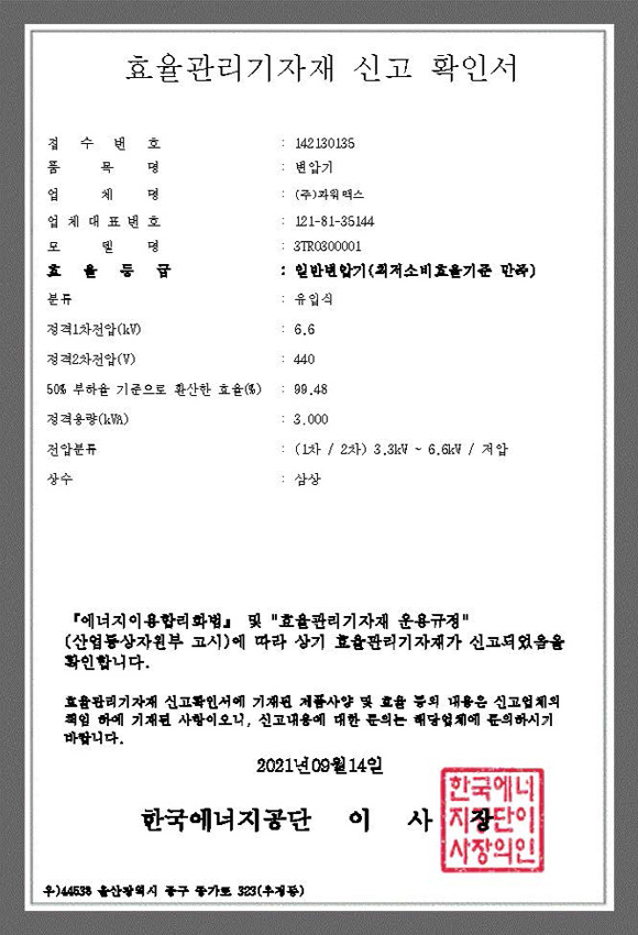 효율관리기자재 신고 확인서 (3000kVA 전력용 변압기)