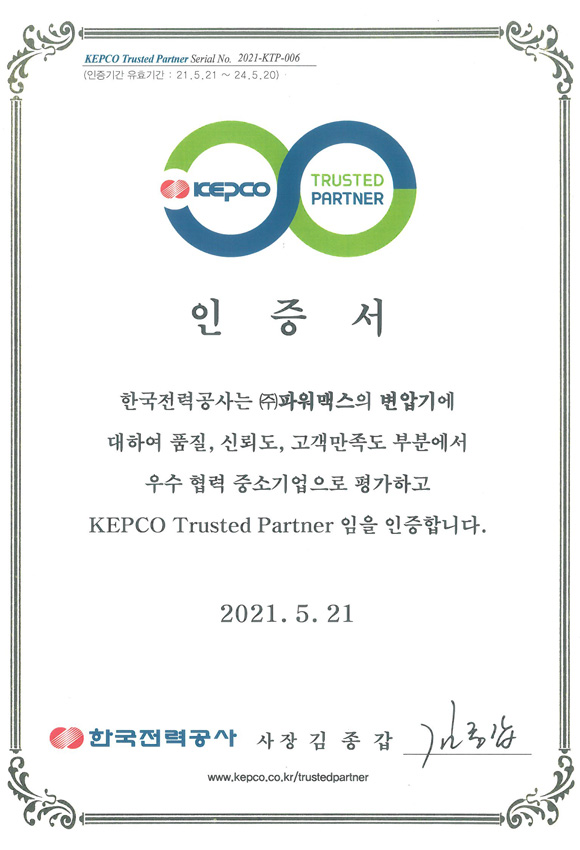 감사장 – 한국전력공사 (아몰퍼스변압기)